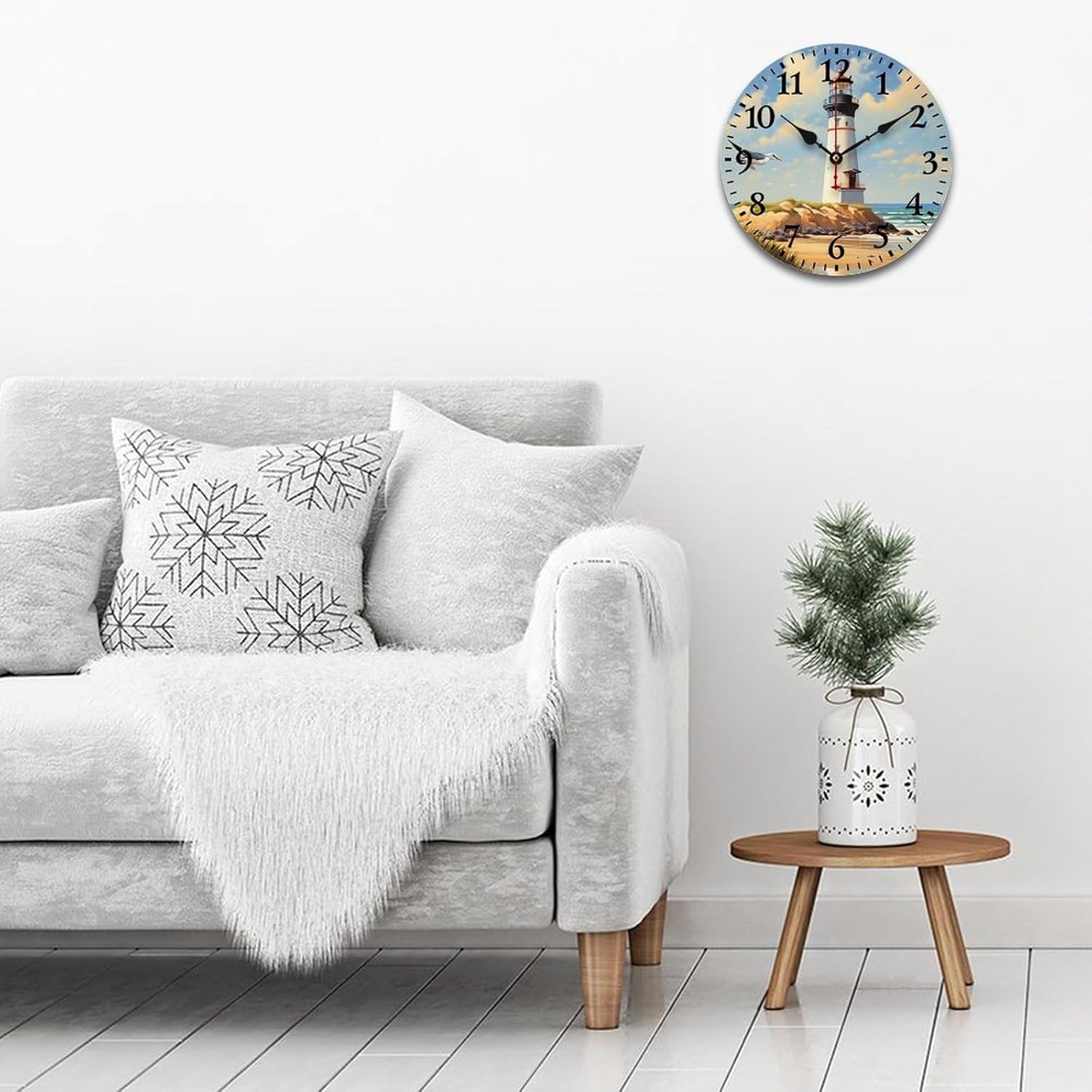 Nautical Theme Lighthouse Kitchen Wall Clock 16 Inch Farmhouse Antique Silent Non Ticking Battery Operated Vintage Country Rustic Distressed Wood ClockLarge Number-Large numbers, easy to see from a distance or sideMetall Hands-The precise metal hands tell the time exactly, durableMetall Hands-The precise metal hands tell the time exactly, durableSuper Quiet-Quiet sweep second hand, no"TICK TOCK" to ensure a good sleepingBattery-Requires one AA battery (not included in the package)Easy to Hang-Back slot design offers easy installation, 1 non-track hook includedLarge decorative round wall clock is perfect for office ,living room, classroom, bedroom, bathroom.Please check it before usePlease check that the second hand is bent before use.All our products are strictly inspected,but this problem is unavoidable in the course of transportation.If the hands are curved, you can adjust them directly with your hands to keep them parallel.We apologize for the inconvenience.
