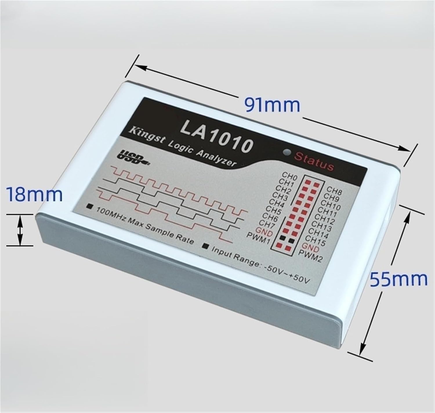 Logic Analyzers1pc LA1010 16CH USB Logic Analyzer MCU ARM FPGA Debug Tool.Input channels: 16 MAX.Max sampling rate: 100 m.Measurement bandwidth: 20 m.Min pulse width captured: 20 ns.Max sampling depth: 10 G / channel.Input voltage range: -50 ~ +50 V.Input impedance: 220 K, 12 pF.Adjustable threshold voltage: -4 ~ +4 V, step: 0.01 V.PWM channels: 2.PWM frequency range: 0.1 ~ 10 MHz.PWM frequency adjust step: 10 ns.PWM pulse width step: 10 ns.PWM output voltage: +3.3 V.PWM output impedance: 50 .Standby current: 100 mA.Max operating current: 150 mA.Dimensions: 95 x 55 x 23 mm