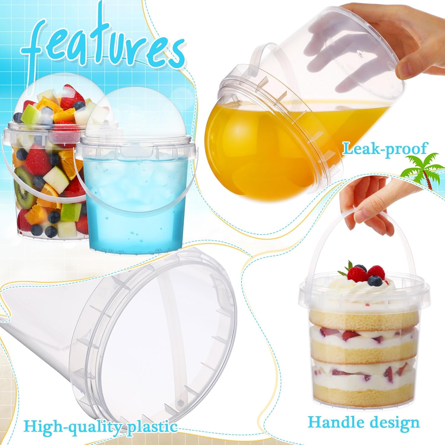 features: elevate your commercial food presentation first impressions are everything in the food industry; if you run a local bakery, cafe, or food truck, these clear, oversized tubs offer a premium packaging solution that makes your products impossible to ignore; the brilliant transparency mimics high end glass, allowing the vibrant colors of your fresh fruit bowls, layered desserts, or specialty baked goods to shine through; the integrated handle adds a touch of modern convenience, making your treats the ultimate "grab and go" choice for busy customers. the perfect blank canvas for diy favors transform any ordinary gathering into a memorable event; the smooth, unbranded exterior of these 34 oz buckets serves as an ideal blank canvas for your creative vision; easily apply customized vinyl decals, elegant ribbons, or your unique business sign to match your party's theme; fill them with an assortment of candies, baked goods, or small keepsakes to create spectacular, personalized take home favors that your friends, bridesmaids, or event attendees will absolutely adore and appreciate. specifications: material: pp color: clear capacity: about 34 oz/ 1000 ml package includes: 30 x clear plastic cups notes: manual measurement, please allow slight errors on size. the color may exist a slight difference due to different screen displays