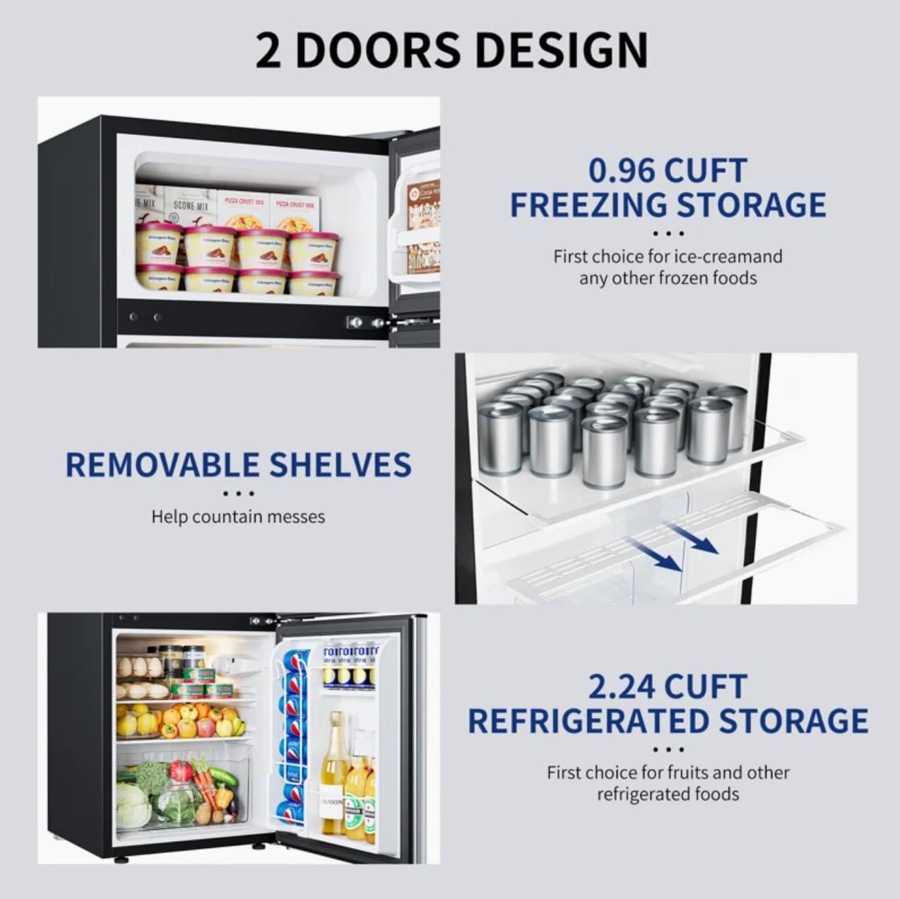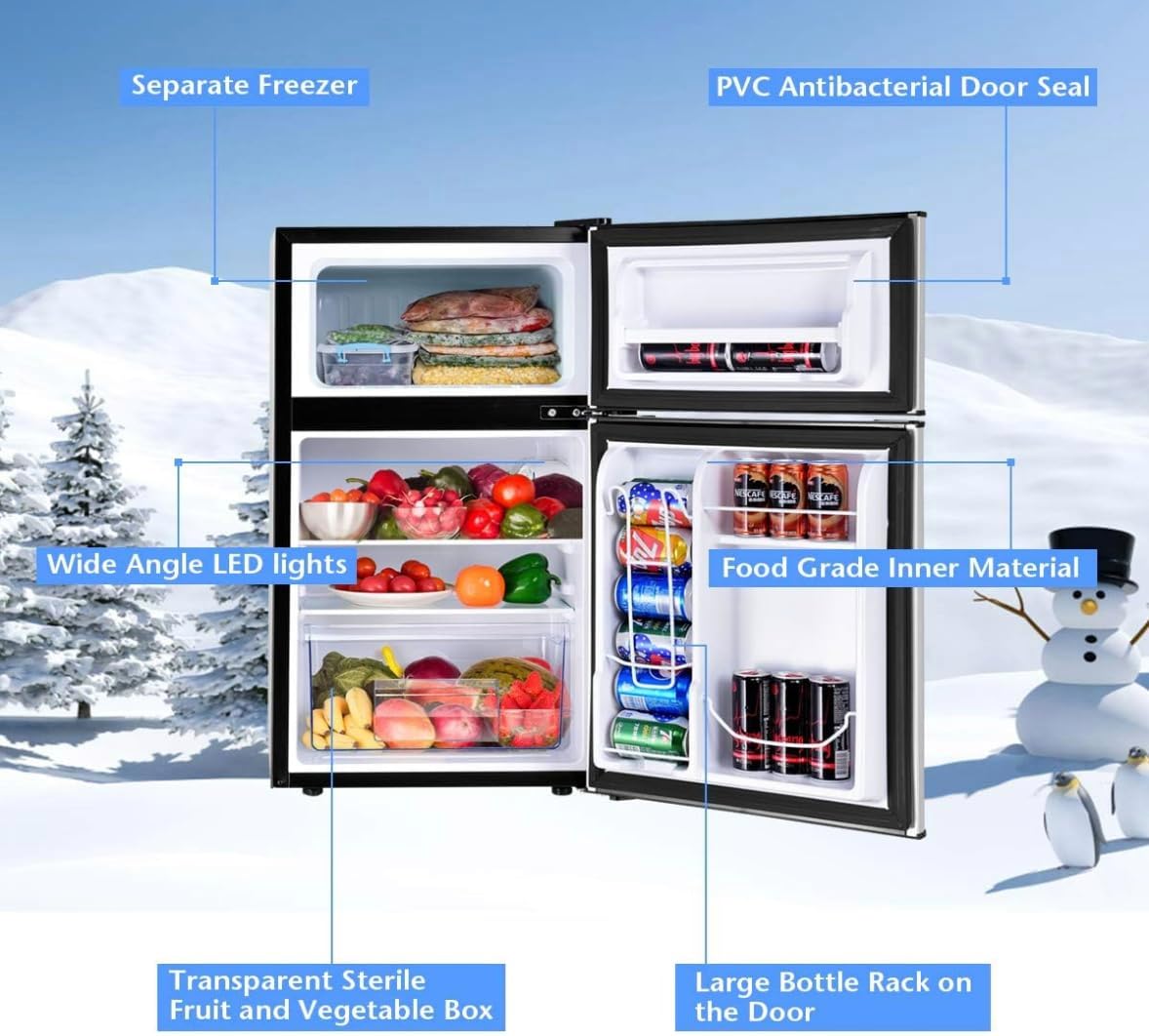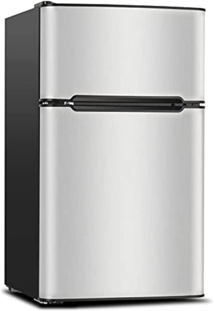 PRODUCT DESCRIPTION──────────────────────▲ 3.2 Cu.Ft. Mini Refrigerator with Freezer ▲ 2 door mini fridge with freezer dimension is 17.8''W * 20.5''D * 33.5''H, can be placed under your desk.▲ Reversible door that can be set to open from left or right, suit for different environments. ▲ Adjustable feet of mini refrigerator adapting to uneven surfaces. ▲ Removable glass shelves can be removed,if you want put some taller thing.▲ LED interior fridge light makes you easier to find things at night.▲ The crisper drawer is designed for your separate vegetable or fruits.▲ The Soft detachable door seal makes cleaning easy.──────────────────────☑ The noise generated by small refrigerator at work is only 37db. ☑ Supported by Energy Saving certificate, it only 0.73 kWh per day. Both affordable and low-carbon lifestyle.☑ No need laborious defrosting by your hands, just press the defrost button in the middle of the temperature control knob. ☑ Mini refrigerator with freezer Support 7 temperature settings, ranging from 23 °F to 50°F to Offer your different needs.☑ 0.98 CU FT for ice cream or frozen food. 2.02 Cu.Ft for fresh food or drinks,milk.DETAIL──────────────────────- Color: Black - Size: 3.2 cubic feet small refrigerator and freezer- Reversible Door: Yes- Adjustable Leg: Yes- Temp Control: 7 temperature modes- Defrosting: One-touch easy Defrosting- mini fridge with freezer stainless steel- college dorm refrigerators