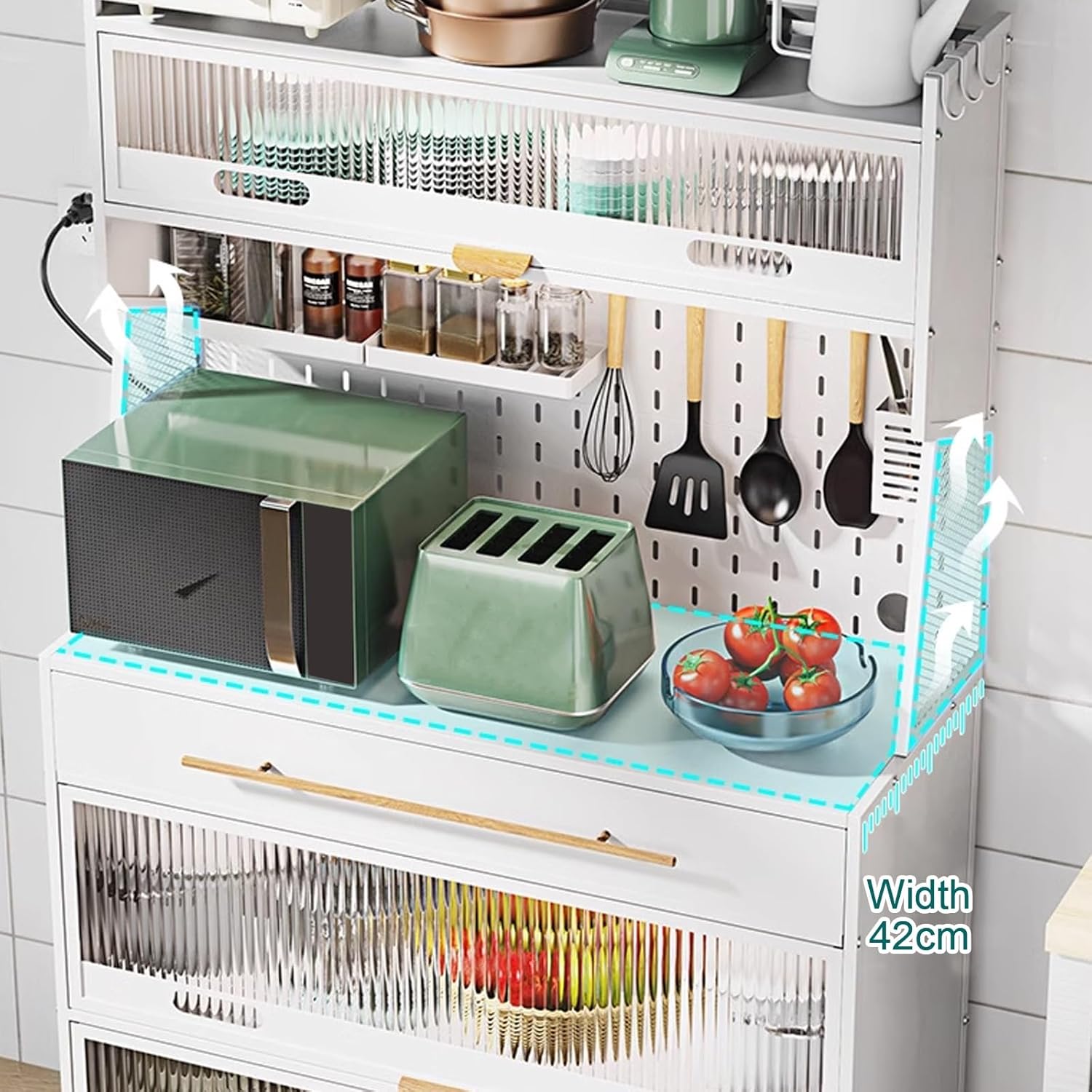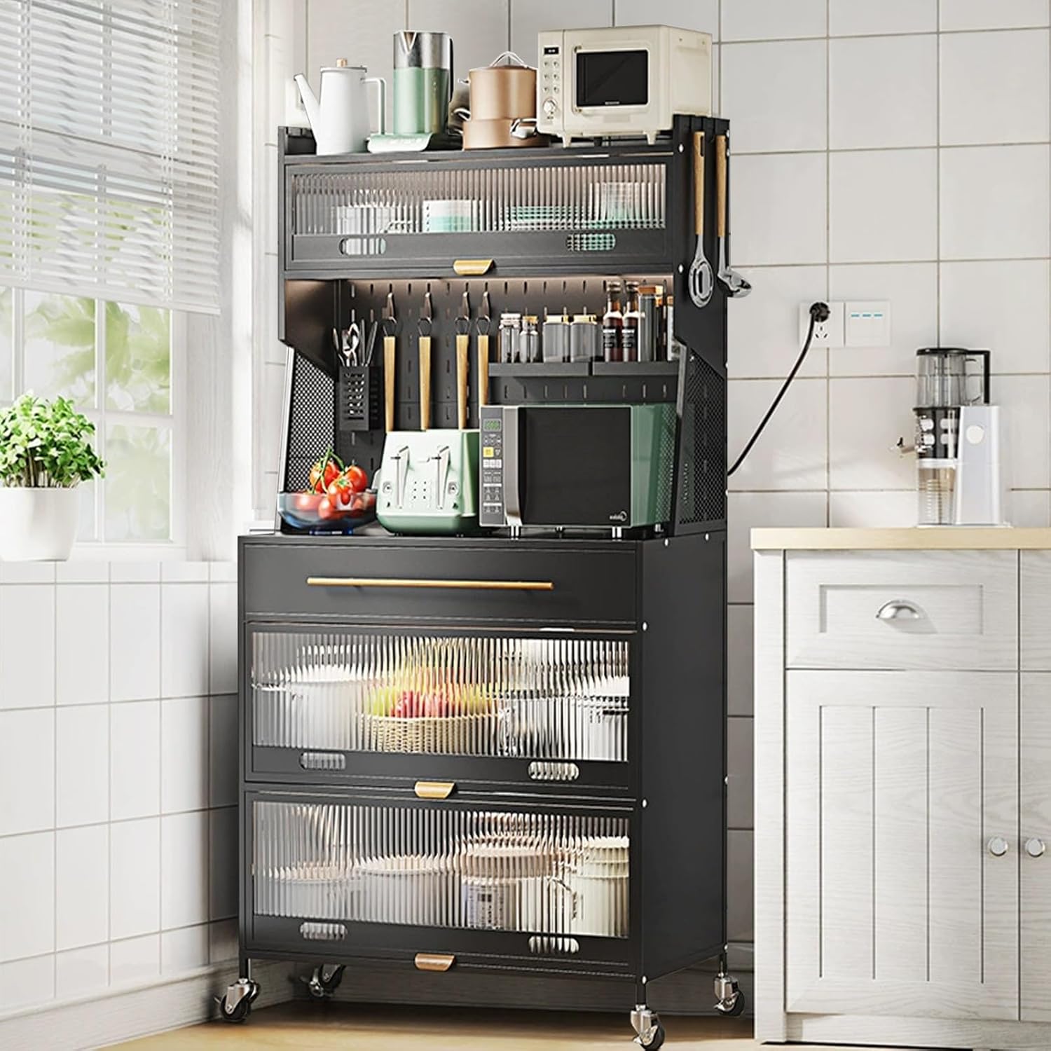 kitchen storage rack:Product Description: Name: Kitchen baker's rack with flip door cabinet, kitchen hutch storage cabinet, kitchen pantry cabinet with microwave shelf, kitchen bar cabinet Material: Carbon steel Color: Black, white DIY installation required Package: Bakers rack (Set) x 1, Chopstick holder x 1, Hook x 4, Seasoning tray x 2, Wheels x 4 Note: We are manually measuring, there may be an error of 1-3cm, please prevail in kind.