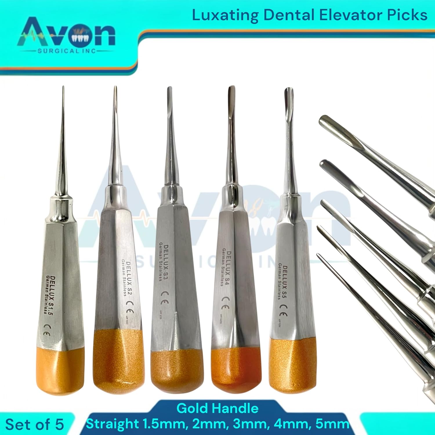 Precision Luxation: Straight Tip designed for precise and controlled tooth luxation during dental extractions. Hollow Handle Design: Lightweight, ergonomic hollow handle provides excellent tactile feedback and reduces hand fatigue during procedures. Distinctive Color Ends: Easily identifiable color ends for quick recognition and organization within your dental instrument set. German Stainless Steel: Constructed from durable, corrosion-resistant German stainless steel for long-lasting performance and reliability. Color Options: Blue or Gold - 1.5mm, 2mm, 3mm, 4mm, 5mm ( Set of 5).