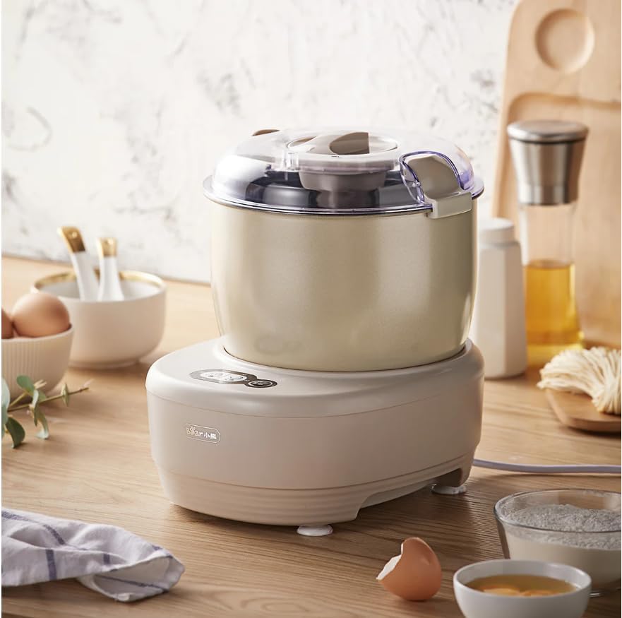 The Bear electric dough mixer is a powerful and versatile kitchen tool designed to simplify your baking process. This stainless steel mixer provides efficient mixing power for a wide range of recipes, from light cake batters to thick bread dough. The speed control allows you to customize your mixing speed according to the ingredients, ensuring precision and consistency every time. This large capacity mixer can handle both kneading dense dough and whipping delicate creams.STAINLESS STEEL MIXERThe stainless steel bowl offers ample space for large batches, making it perfect for family-sized baking or meal prep. Its sturdy, heavy-duty mixer design ensures durability and easy maintenance. The mixer for bread and pastries also comes with three essential attachments: a dough hook for kneading bread, a whisk for whipping creams and meringues, and a flat beater for mixing batters and frostings. These attachments make it a versatile tool for all your baking needs.The kitchen mixer is designed with convenience in mind, the tilt-head feature provides easy access to the bowl and attachments, making it simple to add ingredients or switch accessories. Because the detachable sections are dishwasher safe, cleaning up is simple. Whether you're an experienced baker or just starting out, this electric dough mixer's professional-grade performance for handmade bread, cakes, pastries, and more makes it a must-have for any kitchen.