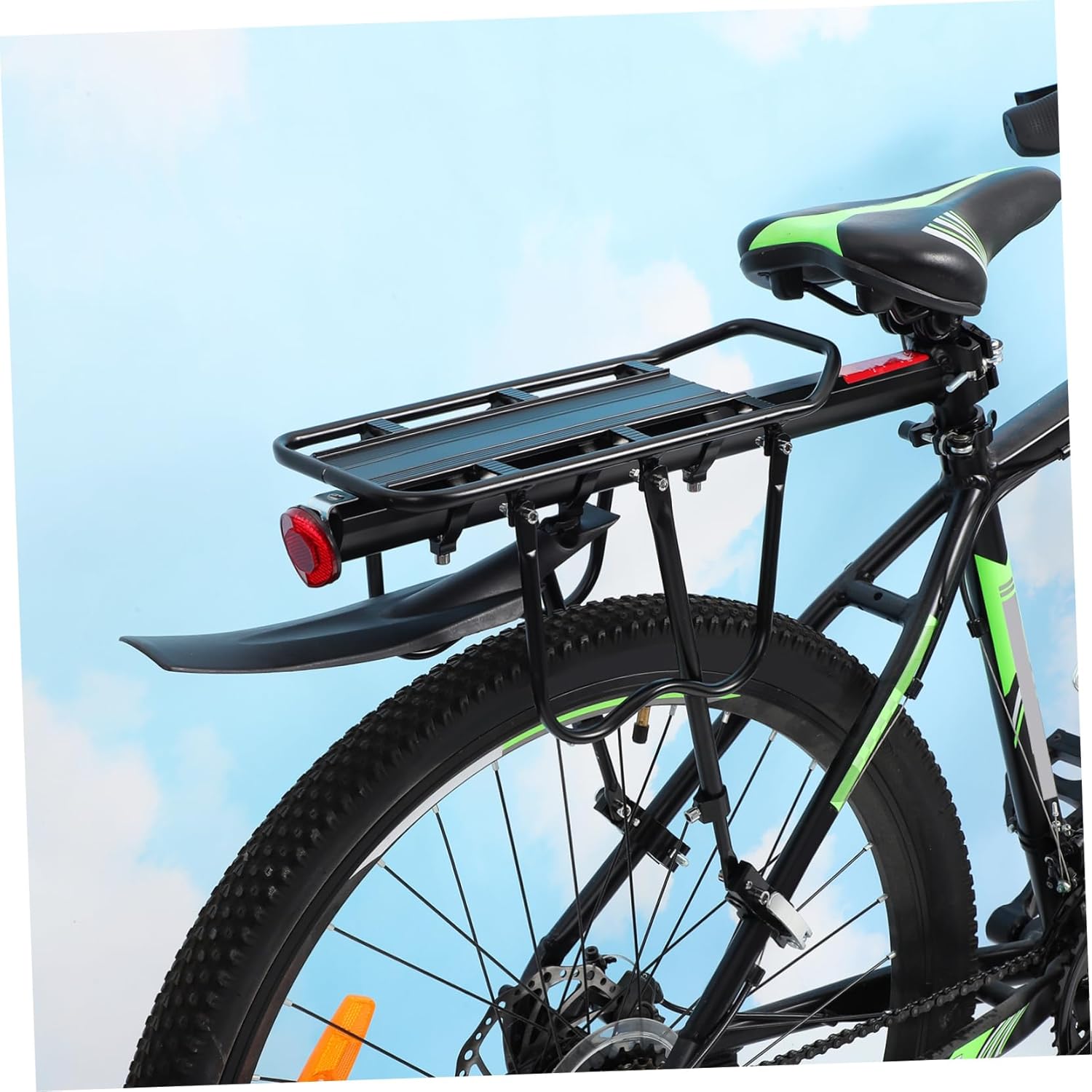 Package Include 1 x set of bike rear rack Characteristics -Material:Aluminium alloy Bicycle Accessories -Loading capability: Engineered to bear heavy loads safely, this bike rack enables riders to confidently transport cargo with both convenience and stability Bike Cargo Rack. -Flexible mounting: With its flexible attachment system, the bike luggage rack conforms to different bike frames, featuring broad compatibility and tailored fitting Bicycle Cargo Rack. -Mudguard defense: The rear mudguard included repels water and mud splashes, ensuring you remain clean and comfortable during rainy rides Bike Rack For Back Of Bike. -Note: fit seat post with a diameter under 32cm Rear Bike Rack. -Size:54.00X35.00X14.00cm/21.22X13.76X5.50in Bike Luggage Rack -Enhanced visibility: Rear-facing reflectivity on the bike cargo rack heightens visibility for cyclists in dim lighting, augmenting safety Bike Rear Mud Guard. -Strong yet lightweight: Crafted from aluminum alloy, this rear bike rack presents a sturdy carriage option that doesn't burden your bicycle with extra weight Bicycle Cargo Rack Mount. -Color:Black Bicycle Rear Seat Frame -Load capacity: around 25KG Bike Rear RackGoods InformationBike Luggage Stand Upgrade your cycling experience with our rear cargo rack, constructed from lightweight yet sturdy aluminum alloy.Bike Rack Mount Designed to include an adjustable rear mudguard and a high-visibility reflective tail, this rack brings not only added storage capacity but also enhanced safety during low-light rides