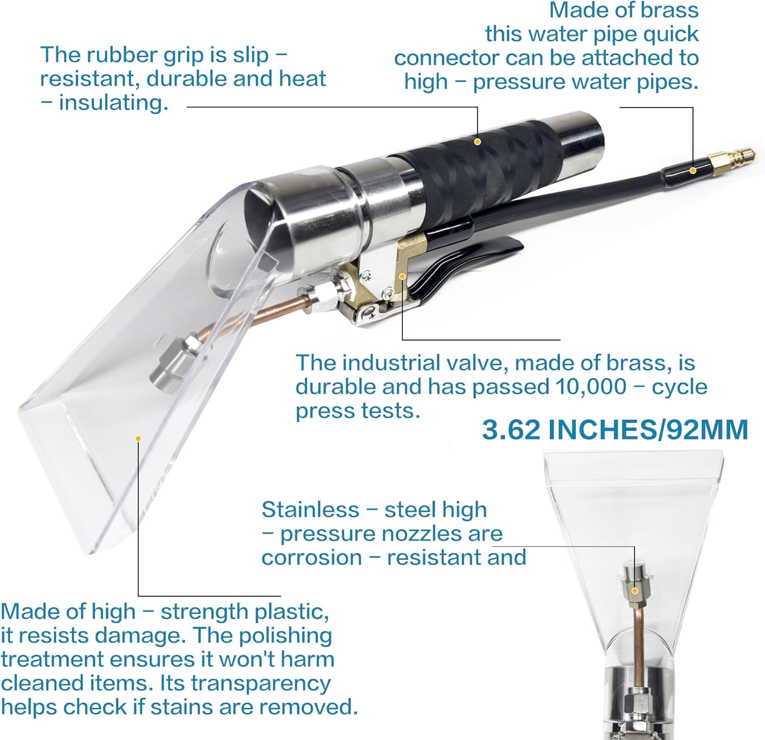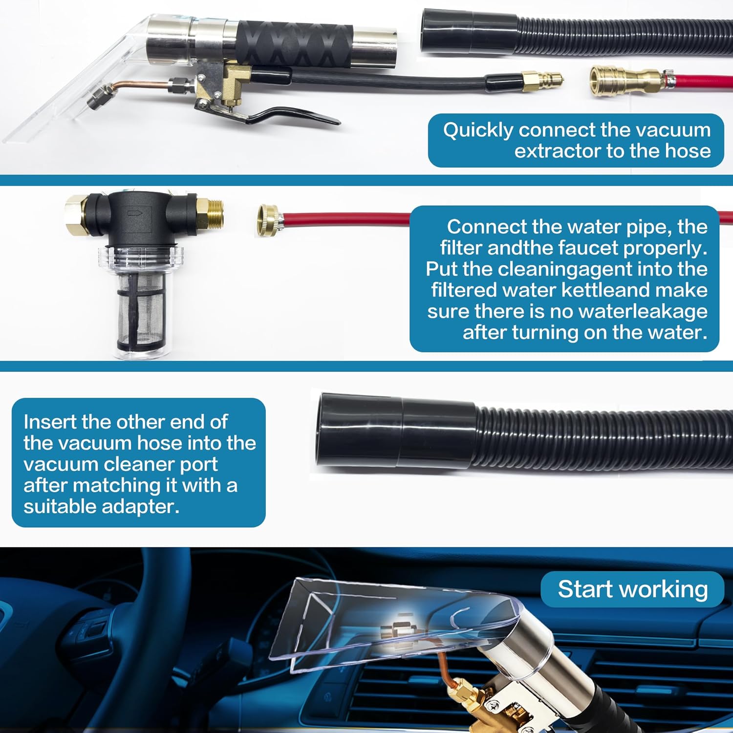 Professional-Grade Carpet & Upholstery Vacuum Extractor Kit - Product Description Elevate your cleaning routine with our Professional-Grade Carpet & Upholstery Vacuum Extractor Kit, a game-changing accessory that transforms your existing 2" inlet compatible wet/dry vacuum into a versatile deep cleaning powerhouse. Designed to tackle a wide range of surfaces including carpets, auto interiors, upholstery, mattresses, and stairs, this kit boasts a detachable wand/hose assembly that seamlessly converts the system back to a standard vacuum, delivering extraction power on par with commercial-grade machines for both residential and professional use. One of the standout features of this extractor kit is its universal wet/dry vacuum compatibility, working flawlessly with leading brands such as Shop Vac, RIDGID, Stanley, DeWalt, and Vacmaster. It comes complete with two precision adapter sizes (2.26" and 2.65") and 8 Velcro hose brackets, enabling lightning-fast setup and making it the ideal choice for home detailing projects as well as professional cleaning services. Engineered for premium performance and built to last with heavy-duty construction, the kit includes a transparent upholstery wand, a 10ft vacuum hose, and a 25ft high-pressure waterline rated up to 300 PSI. It is equipped with HEPA-grade water filters that effectively prevent clogs, ensuring uninterrupted operation, and a shatter-resistant clear head that provides real-time visibility of your cleaning progress, so you can target stains and dirt with precision. The tool-free design further enhances its user-friendliness—no additional tools are required, just attach the kit to your vacuum’s wet/dry mode and start cleaning. The flexible hose system effortlessly reaches hard-to-reach areas like stairs, pet beds, and car upholstery, while the combined spray and extraction functions powerfully lift deep stains and eliminate embedded odors, leaving your surfaces fresh and spotless. When you choose our extractor kit, you’re not just getting a top-tier cleaning tool—you’re also unlocking unmatched value and comprehensive coverage. We stand behind our product with 24/7 troubleshooting customer support, a 30-day free policy, a 12-month manufacturer's warranty, and dedicated technical support, all backed by a 100% satisfaction guarantee. Whether you’re a homeowner looking to upgrade your cleaning arsenal or a professional cleaner in need of reliable equipment, this extractor kit is the ultimate solution for all your deep cleaning needs.