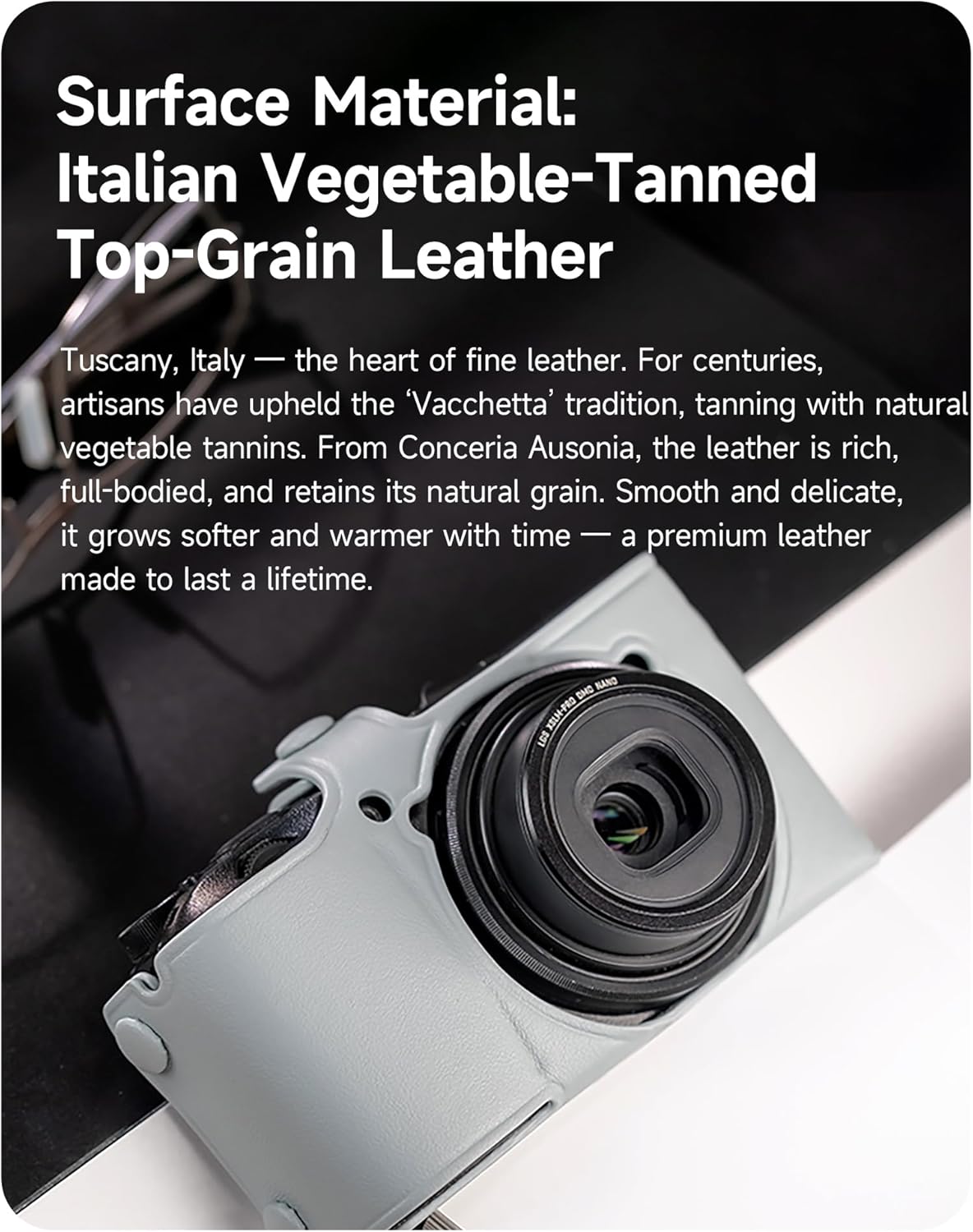 Elevate your Ricoh GR III, GR IIIx ,or GR II camera's protection with this premium Italian vegetable tanned cowhide leather case. This full-wrap design offers comprehensive protection while adding a touch of sophisticated style to your photography gear. The case is meticulously crafted from high-quality cowhide leather, known for its durability and ability to develop a beautiful patina over time. The vegetable tanning process gives each case unique character and ensures the leather ages gracefully. This custom-fitted case provides precise access to all essential camera controls and functions, allowing you to capture moments without compromise. The natural leather construction combines classic aesthetics with practical functionality, making it an ideal choice for both casual photographers and professionals who value both protection and style.