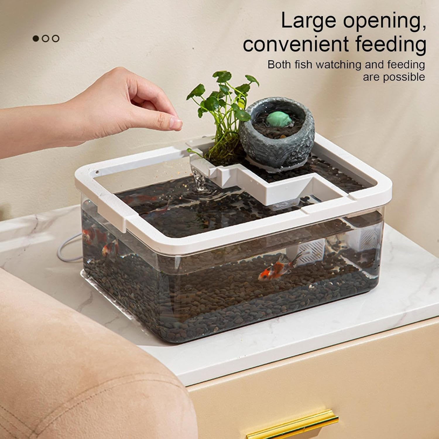 This compact fish tank combines vertical hydroponics with an innovative USB pump and lighting system. Designed for betta, shrimp, and even jellyfish, it transforms any desktop, bookshelf, or studio into a quiet reef-like setting. A thoughtful addition to hospitals or bedrooms, blending ancient aquaponic principles seamlessly into daily life.Specification:Product name: Small fish tankProduct color: black, whiteProduct size: about 29x22x12cm/11.42x8.66x4.72 inchesProduct weight: 1750gProduct material: ABS+Polystyrene+stonePower supply: USB cableVoltage: 5VFunction: Anti-leakage and anti-electricityProduct List:1 * Small Fish Tank1 * Pump1 * Stone Bowl1 Pack * GravelNotes: Due to different lighting and screen settings, the product color may be slightly different from the picture.Due to the difference in manual measurement, please allow a 1-3cm difference in size.