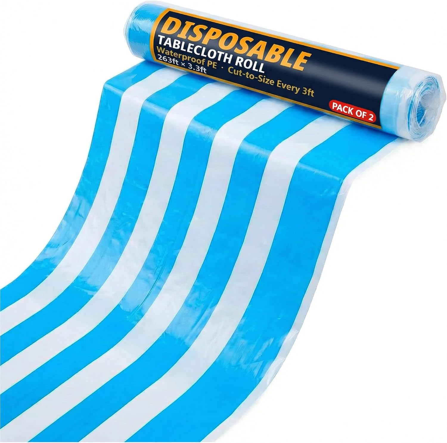 BLUE & WHITE STRIPED DISPOSABLE TABLECLOTH ROLL - WATERPROOF & EASY CUTTransform your event setup with this Blue & White Striped Disposable Tablecloth Roll, designed for both practicality and style. Made from durable PE material, itโs waterproof, stain-resistant, and lightweight, offering reliable protection against spills, oil stains, and scratches. The classic striped pattern brings a fresh and elegant touch to any dรฉcor, perfect for both casual and formal celebrations.Measurement:Measuring 40-inches wide and 2838-inches roll, it covers multiple tables with ease. Pre-marked cutting lines every 3-ft make it simple to size for any table, just cut, spread, and youโre done. One roll offers 2838-inches of elegant Blue & White Striped Disposable TableclothStyle & Convenience for Any Occasion:Unlike reusable cloths, this disposable option offers quick cleanup with no washing or storage. Ideal for birthdays, weddings, BBQs, picnics, catering, and more, it combines style, convenience, and function in one roll.FEATURES:Waterproof & Stain-ResistantElegant Stripe DesignLightweight & Easy to UseQuick CleanupMulti-Occasion UseDurable PE MaterialRoll Length 263-ft