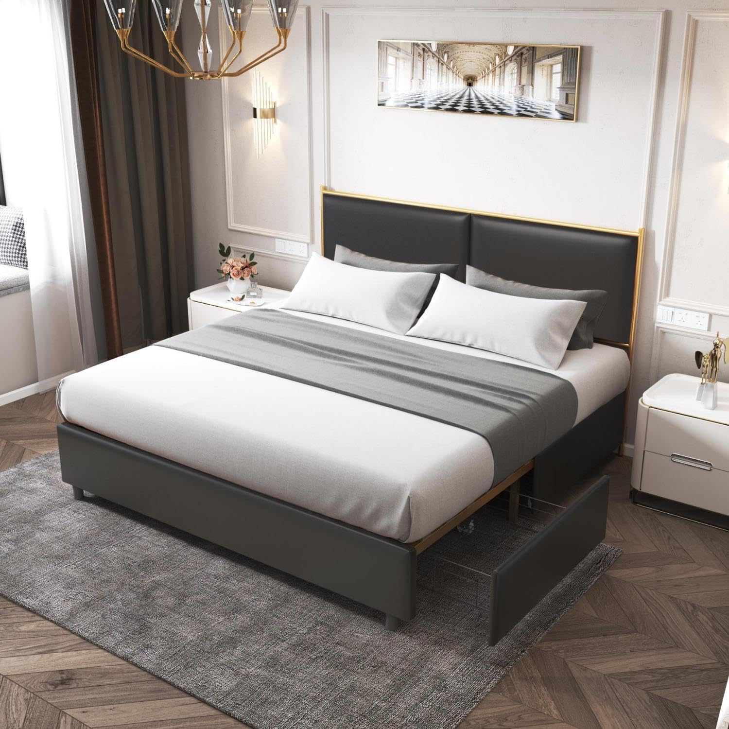 Dolonm Black Leather Upholstered Storage Bed Frame King SizeBrand StoryWelcome to Dolonm, where luxury meets functionality in our exquisite range of furniture. We pride ourselves on crafting premium quality pieces that elevate your living space.Product StoryIndulge in the ultimate relaxation experience with our Dolonm black leather upholstered bed frame. The classic steamed bread style beckons you to unwind in style while the high-quality soft thick leather fabric cradles you in luxurious comfort. The combination of high elastic sponge and solid wood back ensures a supportive and blissful slumber.Product Function Detailed ExplanationMaximize both style and storage with our multi-functional king size bed frame. Featuring four wire drawers equipped with smooth rollers, easily slide them in and out to conveniently store your essentials such as sheets and clothes. Keep your space organized while adding a touch of elegance with our sophisticated design.Specification Information and Usage Instructions● Weight Capacity: 850 pounds● Recommend Mattress Thickness of Bed: 8-12'' ● Dimensions: King Size Bed Frame (83"L x 78.5"W x 43"H) ● Material: High quality soft thick leather fabric, solid wood, metal frame● Assembly: Easy installation with all parts, tools, and instructions included in the packaging. Assemble with ease in just 40 minutes with two people.Additional Information- Enjoy a noise-free sleep experience with Dolonm upholstered bed frame slats integrated with Velcro and EVA sound bars to eliminate friction.- Stable construction with 11 thickened solid wood strips combined with a metal frame for enhanced durability and support.- Perfect for various mattress types, our padded platform bed ensures a stable foundation for your restful nights.Elevate your bedroom decor with Dolonm's Black Leather Upholstered Storage Bed Frame. Experience the perfect blend of style, comfort, and functionality in one luxurious piece. Upgrade to a new level of sophistication with Dolonm. Get yours today!