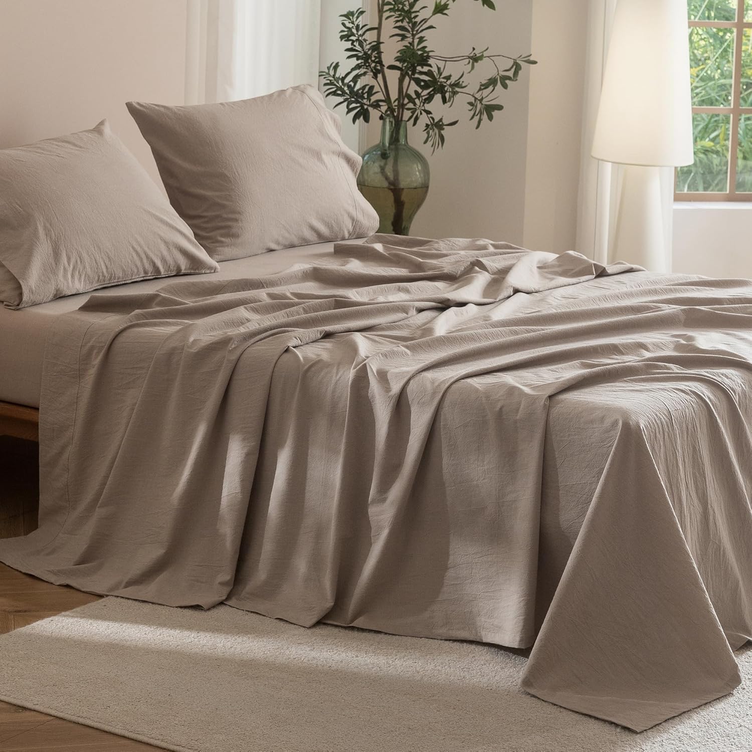 Elevate your sleep sanctuary with the JIYUAN 4-Piece Sheet Set. Designed for those who seek both effortless style and uncompromising comfort, this complete set transforms your bed into a haven of softness and serene beauty. Crafted from premium 100% washed cotton, the fabric is pre-washed to achieve a luxuriously soft, linen-like texture that feels beautifully broken-in and gentle against your skin from the very first night. The breathable weave promotes optimal airflow, ensuring a comfortably cool and dry sleep environment that adapts to you throughout the night. The set includes a deep-pocket fitted sheet that securely hugs mattresses up to 16 inches, a generous flat sheet for versatile styling, and two matching standard pillowcases. Built for durability and easy care, these sheets are designed to maintain their color, softness, and elegant texture wash after wash. Experience the perfect blend of rustic charm and everyday luxury for a restful retreat every night.