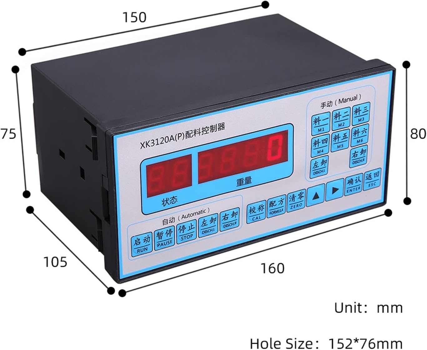 Main functional parametersA combination of weighing indicator and auto- batch controller.With RS232 print interface,real-time printing of ingredients data can be achieved.(optional)Completely feeder controller systemSimultaneous control of up to 6 kinds of different materials.Inch precision metering Two methods of discharge controlControl the quantity of tankAutomatic zero trackingKey to peelAutomatic net weighing keyManual balance preset and auto- adjustmentComplete digital adjustment softwareAuto-self correction and improved measurement precisionFlexible operating and tare weight can be independently updated Tank number report and materials conditions instructionWeight:0.78kg