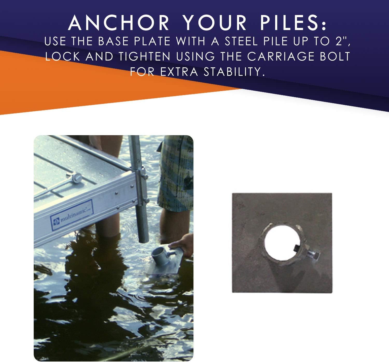 Multinautic Galvanized Square Base Plate 6” x 6” Build a strong foundation for your wooden or aluminum stationary dock using the Multinautic square base plates. Secure your dock and prevent sinking or shifting over time, keeping it level and aligned. Compatible with all steel round piles up to a diameter of 2". Use the carriage bolts to stabilize the base to the post. Hot dipped, the galvanized steel makes the plate rust and corrosion resistant, perfect for an underwater environment. This simple solution is a must have to ensure your dock stays strong and straight for many years.
