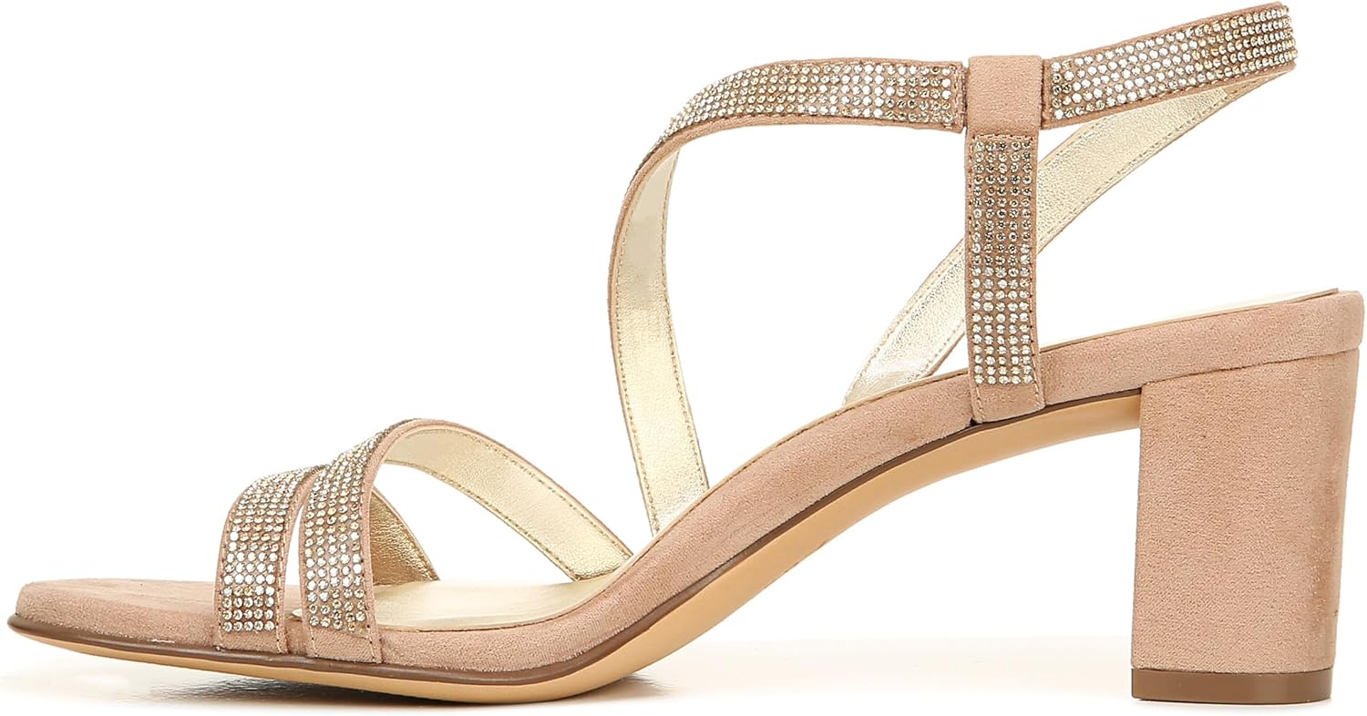 From our Party Ready and Wedding Shop collections // Long-lasting comfort. From day to night, these strappy sandals for women let you get into party mode. Available in narrow, medium and wide width heels for women, you have options. All-day womens sandals with slingback strap for easy on/off. Leather or fabric upper with an open toe and sparkly rhinestone crystals on these fashionable women's shoes. Adjustable buckle closure (on leather styles only). Contour+ technology: an innovative cushioning system anatomically sculpted to meet every contour of your foot for a premium fit and all-day comfort experience. Non-slip outsole. 2 1/2 inch block heel. Consciously packaged: 100% of our shoe boxes are made of 80% recycled paper + soy-based ink. Designed using sustainable materials. WHY YOU'LL LOVE IT: Designed to the contours of a woman's foot. Available in an inclusive range of sizes and widths for a custom-designed fit and all-day wear, with a promise of both elegance and utility. The Beautiful Fit. Since 1927. Naturalizer was one of the first shoe brands that women could turn to for the feminine style they coveted and the comfort they thought was impossible to attain. Naturalizer's fresh, unpretentious designs are a smooth fit with your wardrobe, your life and your own unique style. Naturalizer promises style that makes you look good and feel good - always.
