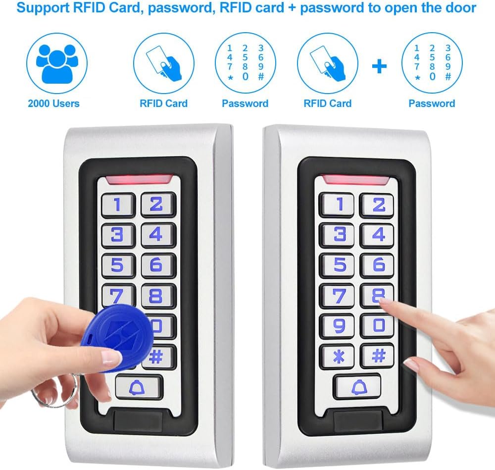 Access Controller 1.IP68 waterproof/rainproof, can be used directly in the rain. Full programming from keyboard, no need to connect to computer. 2.WG26 input/output 3.User Capicity: 2000 user cards 4.Working Frequency: 125KHz 5.Verification Method: RFID card, Password, RFID card+password 6.Waterproof level: IP68 7.Verification Method: RFID card, Password, RFID card+password 8.Reading Distance: 0-10cm 9.Applications: Home/Hotel/Office/Apartment/Factory Access Control System, etc. Power Supply 1.AC input: Standard AC100V-240V 50-60HZ 36W, DC output: DC12V/ 3 A 2.Set NC / NO outputs, can control various types of electric locks. 3.It will protect automatically and no voltage output when short circuit happening in the circumferential circuit. 4.Dimension:100*65*32mm, Material: metal Magnetic Lock Material: aluminium alloy. Holding force: 180 kg/350 lb. Working Voltage: DC12V Working Current: 380-430mA Working mode: locked when power on, unlocked when power off Suitable for wooden door, metal door, glass door. Material: Aluminum alloy shell + iron plateDoor Exit Button 1.Dimensions: 86*86*8mm 2.Material: fireproof ABS plastic 3.Power Input: DC 12V 4.Output Contact: NO / COM RFID Keyfobs 1.Frequency: 125KHz, EM ID type 2.Chip: TK4100 3.Color: blue/white 4. Read Only 5.Quantity: 10pcs Package Including 1 x Access Control Keypad 1 x Power Supply 1 x Lock 1 x Door Exit Button 10pcs RFID Blue Keyfobs 1 x User Manual