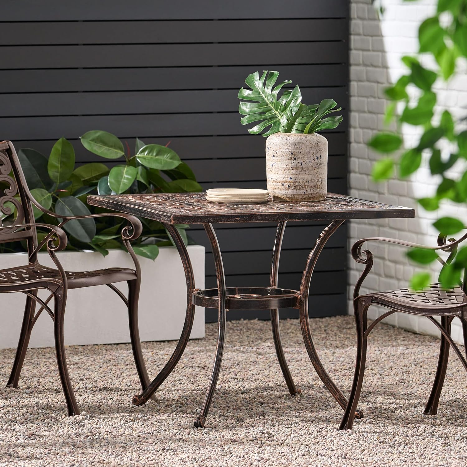 Product Dimensions: 34.75W x 34.75D x 28.75H in Color: Copper Material: Cast Aluminum Weight: 22.05 lbs Shape: Square Room Type: Patio, Garden, Balcony, Dining Room Assembly Required: Yes Umbrella Hole: YesThis square cast aluminum dining table combines durability and elegance with its corrosion-resistant construction and intricate lattice design. Its shiny copper finish adds sophistication, making it an ideal addition to your patio, garden, or balcony. The table’s robust material is designed to withstand outdoor elements, ensuring it will last for years without rusting or tarnishing.Perfect for outdoor dining or as a decorative indoor piece, this table features a built-in umbrella hole, providing shade for added comfort during sunny days. The powder-coated finish ensures easy maintenance, making this table a hassle-free addition to your living space.Assembly is quick and simple, and its sturdy design ensures long-lasting performance. Whether you are hosting an outdoor gathering or enjoying a casual meal, this table enhances the overall dining experience with style and durability.