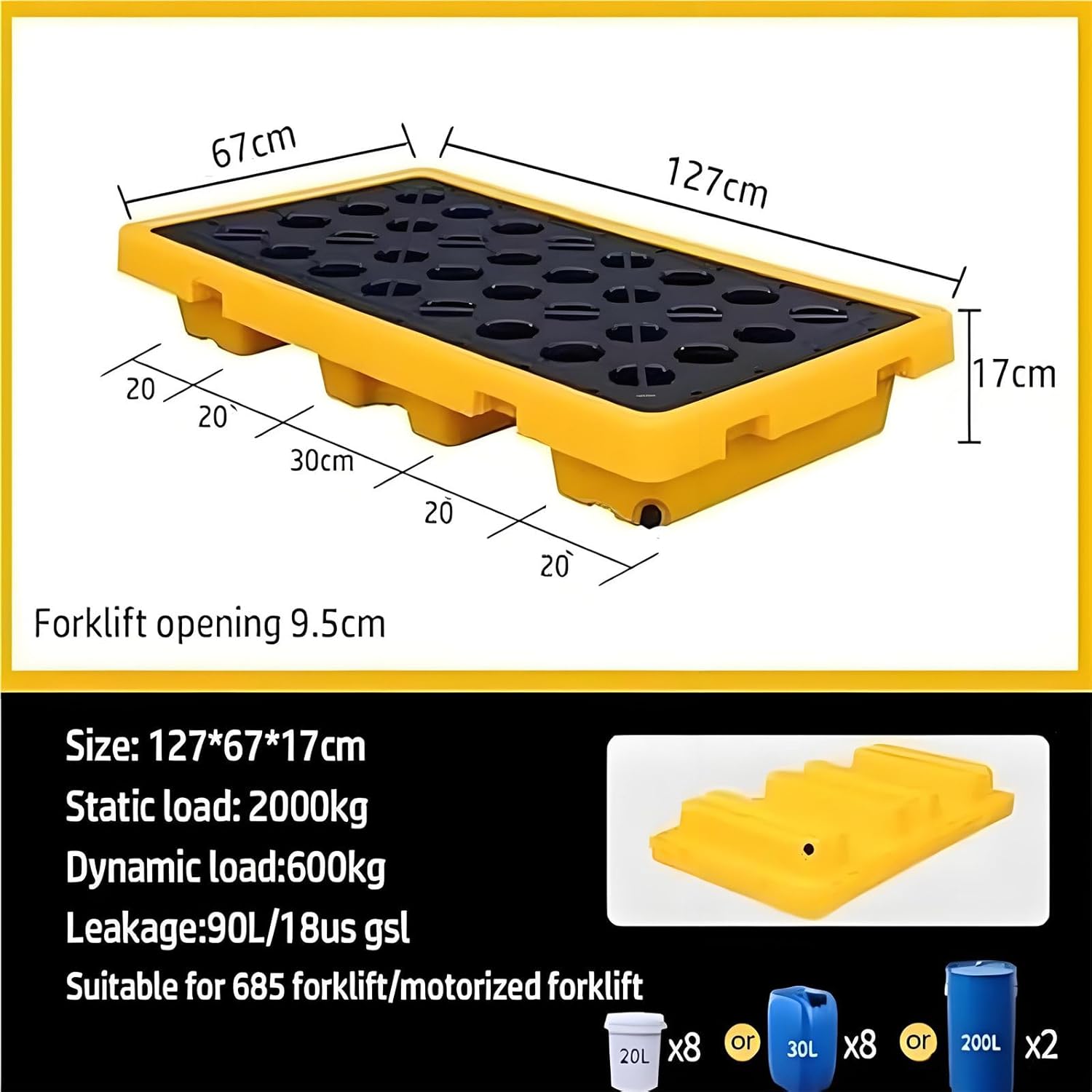 Introducing the Modular Spill Platform, With its seamless construction, this containment tray prevents leaks, protecting against unwanted spills and minimizing the risk of potential fines. The removable top grate simplifies cleaning and maintenance, making it ideals for use in warehouses, aquaculture water storage, and more.Specifications:Name: Modular Spill Containment Platform/Plastic TrayMaterial: PolyethyleneColor: Yellow + BlackSize: 17 sizes availableFeatures: Waterproof, wear-resistant, cold-resistant, load-bearing.Additional Features: Removable, tilting, lifting, storage, push-pullLoad Capacity: Each pallet size has a different load capacity;Applicable scene: Warehouse, workshop, maintenance, supermarket, industrial, commercial, factoryFeatures:Modular platforms are also stackable, save more space for you.Grid-style deck ensures airflow to keep stored items dry and secure.Nonslip thickened surfaces increases friction, reducing the risk of items sliding off.Integrated drain outlets allow for controlled liquid removal from the grated surfaces area.Vivid yellow/black color resists fading for long-lasting visibility.Package Includes1 * Spill Containment Platform