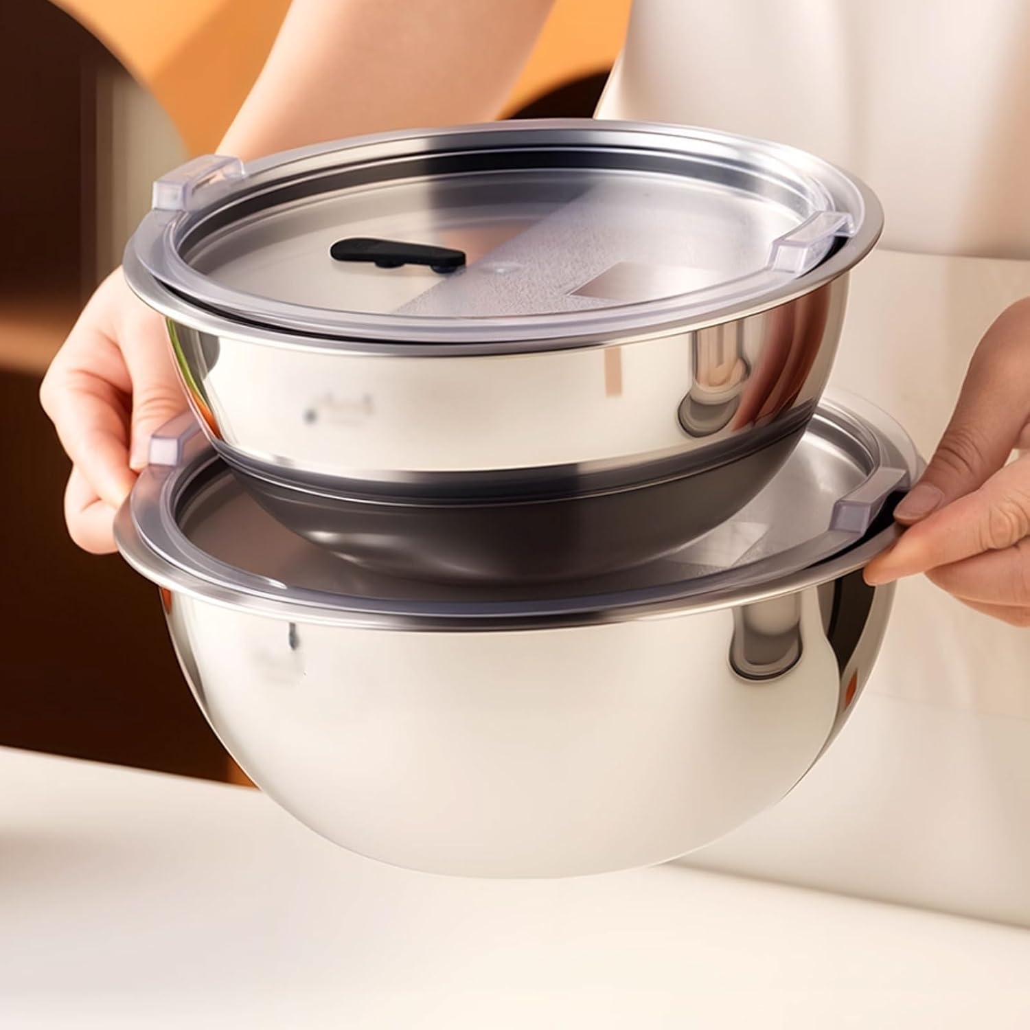 Convenient for storing and carrying food.Material: Stainless steelSize: 18cmx7.4cm/7.0x2.9in20cmx8.3cm/7.8x3.2in22cmx9.2cm/8.6x3.6in24cmx9.8cm/9.4x3.8in26cmx10.7cm/10.2x4.2inCapacity: 1080ml/38.0oz,1500ml/52.8oz,2000ml/70.4oz,2600ml/91.5oz,3500ml/123.1ozColor: silverScope of application: home, kitchen, restaurant, hotel, etc.Packing list: only includes Stainless steel mixing bowl with lid x1 (excluding other items shown in the picture)Kind tips1. Due to the difference in light and display, the color of the picture may be slightly different from the actual object, please refer to the actual object.2. The size is measured manually. If there is a slight error, please refer to the actual product received.3. Please wipe it clean immediately after use.4. For stainless steel products, please avoid scrubbing with hard objects such as steel wool.5. Stainless steel products may have slight wear and scratches on the surface, which will not affect the use.6. Before first use, clean it once, then rinse it with hot water, and wipe it dry inside and out before use.The nestable design saves space and makes it easy to store in shelves or cabinets.