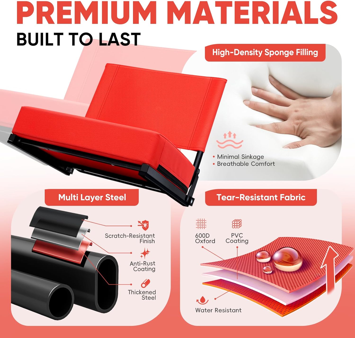 | Additional Features | Padded & Wided Cushion; Lightweight & Portable; Shoulder Strap & Handle; Back Support;Bleacher Hook & Rubber Strip |
