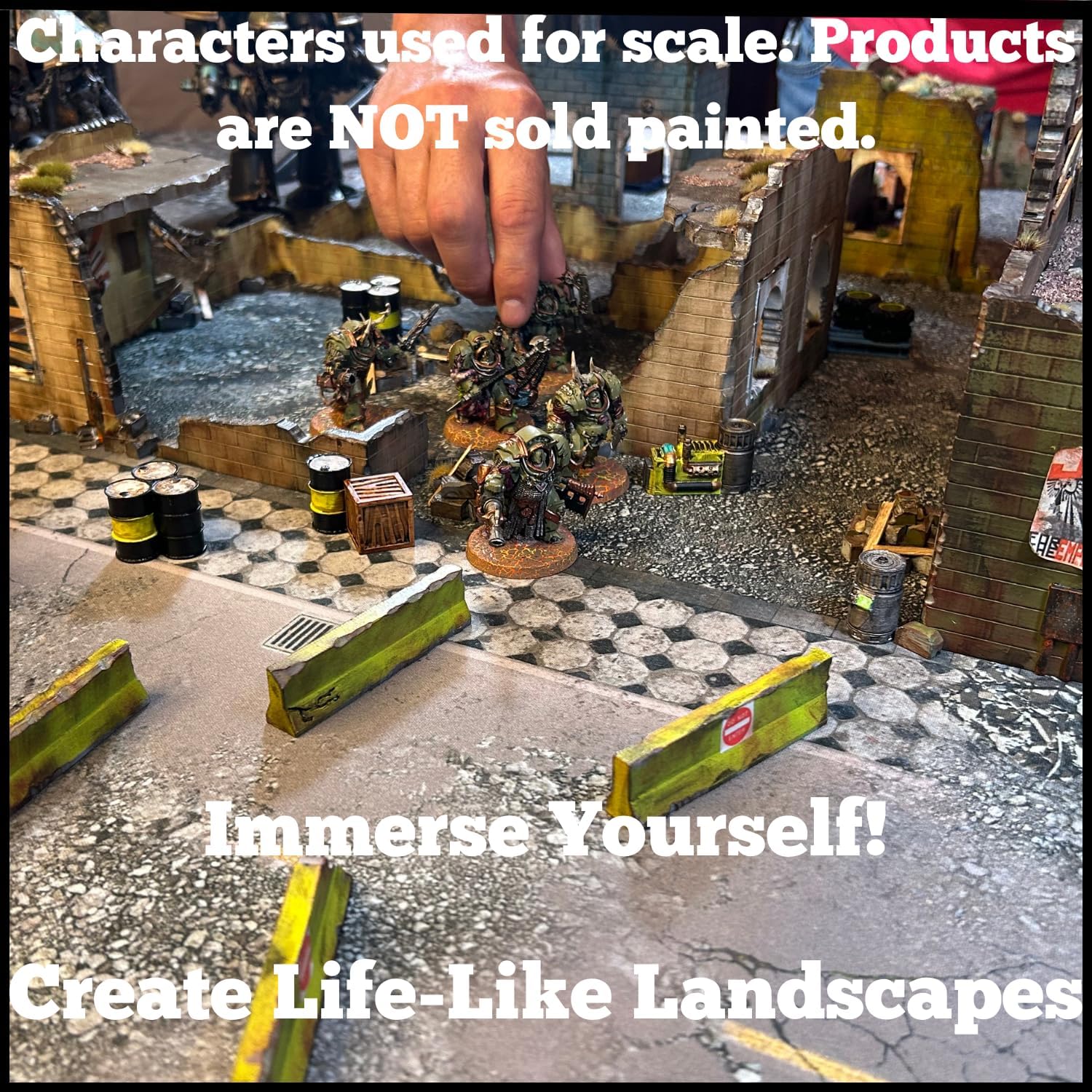 This Building Ruins Set comes with 10 pieces of terrain and includes 1 additional mystery piece. That's 11 pieces total! The set includes 1 Two-Story Building Ruin, 1 One-Story Building Ruin, 4 Jersey Barricades, 2 Brick Piles, 1 Three Oil Drums Cluster, 1 Oil Barrel with Wooden Box / Crate, and a BONUS piece. All terrain is scaled mostly for 28mm to 32mm tabletop wargames, RPG and fantasy games. This set is the perfect addition to any scenery past, present, or future. Truly immerse your characters and units into a world of ruins and your imagination. Pieces require a coat of primer prior to painting. Use primers that are suitable for plastics, follow the manufacturer’s labeling, and allow proper drying time between coats. Products are 3D Printed and may have minor blemishes that are common among 3D prints. Most, if not all, blemishes on our products get filled in during the priming and painting process. We recommend using a “high-build” or “filler” primer. Please note that direct sunlight and high temperatures may result in warping or melting of plastics.