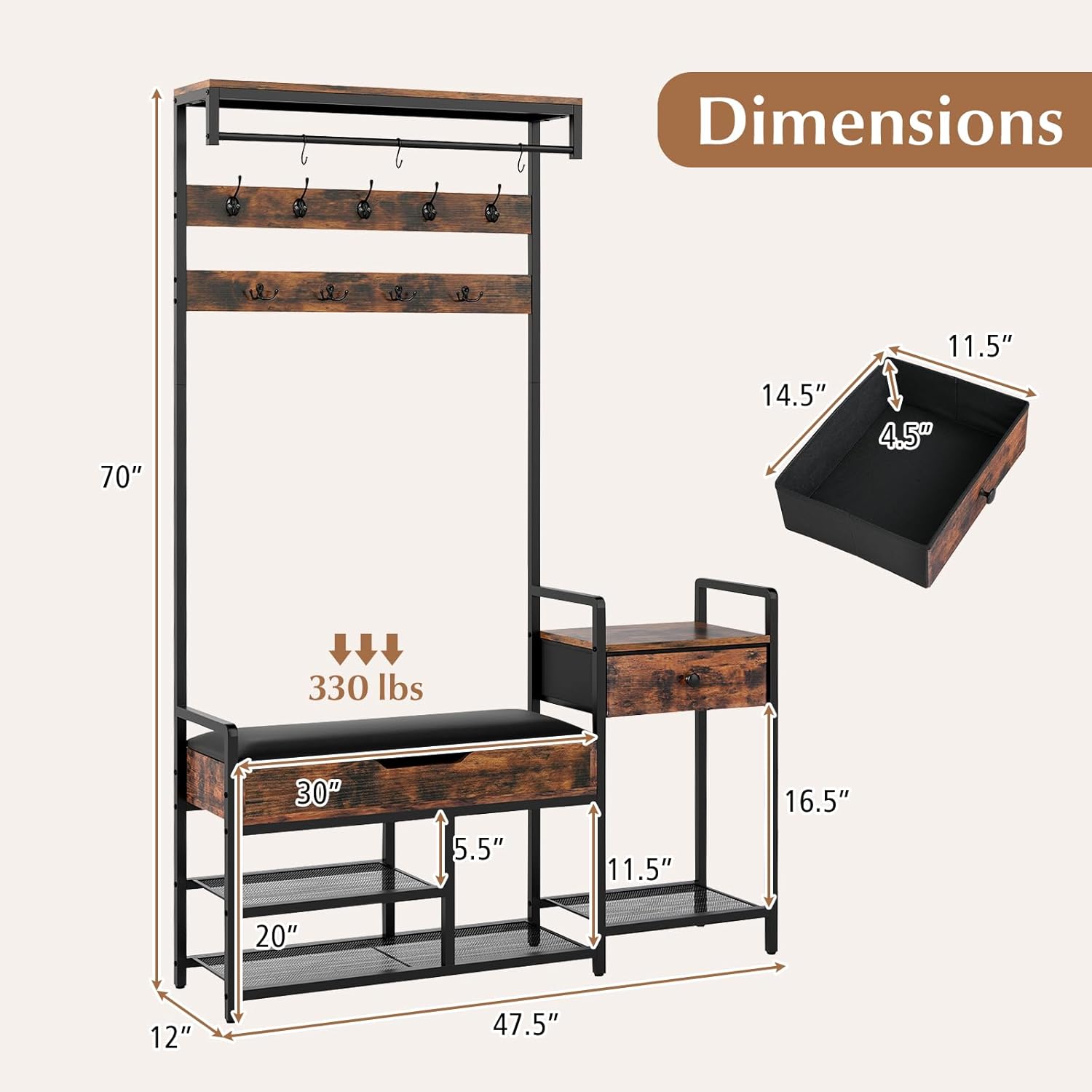 DescriptionTransform your entryway, bedroom, or hallway with this multifunctional hall tree with bench and shoe storage. Merging style with practicality, this industrial hall tree combines a coat rack, storage bench, shoe rack and side table, offering all in one storage solution for your daily essentials. The inclusion of 12 hooks, a drawer and mesh storage shelves ensures everything is tidy and accessible. Designed for comfort and convenience, this coat rack features a cushioned seat, creating a cozy spot to put on or take off shoes. Beneath the seat, a hidden storage compartment helps to keep your space clutter-free. Supported by a robust metal frame and equipped with anti-toppling devices, the hall tree offers great stability and safety. Besides, the adjustable foot pads make it remain stable on uneven floors.Feature5-in-1 design maximizes storage efficiency and space utilization Hanging rod and 12 hooks to hang your jackets, bags, hats and scarvesTop shelf, drawer and bottom mesh shelves offer ample storage space Soft cushioned bench offers a comfortable place to change shoes Hidden compartment under the seat to store items out of viewCut-out handle and robust metal hinge for easy openingPowder-coated metal frame ensures stability and durability2 anti-toppling devices to fix the hall tree to the wall firmlyAdjustable foot pads increase stability and prevent wobblingIndustrial design with rustic brown finish adds a touch of charm Assembly neededSpecificationColor: Rustic Brown + BlackMaterial: Engineered Wood, Metal, PVC, Sponge, FabricOverall Dimensions: 47.5" x 12" x 70"(L x W x H)Inner Size of Drawer: 14.5" x 11.5" x 4.5"(L x W x H)Height from Shoe Bench to Ground: 22”Length of Shoe Storage Bench: 30”Height Between Shelves: 5.5”, 11.5”, 16.5”Weight Capacity of Shoe Bench: 330 lbsWeight Capacity of Storage Bench: 22 lbsWeight Capacity of Wooden Storage Shelf: 44 lbsWeight Capacity of Mesh Shelf: 22 lbsWeight Capacity of Each Hook: 11 lbsNet Weight: 42 lbsPackage Includes:1 x Coat Rack12 x Hooks1 x User's Manual