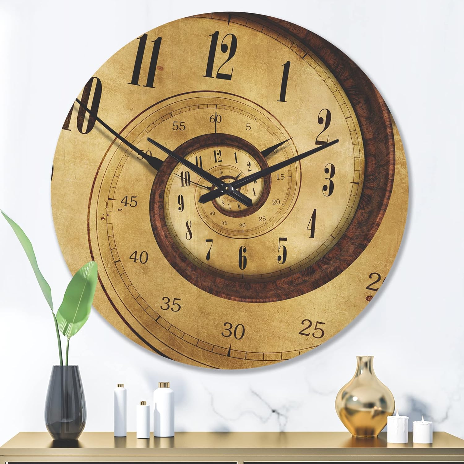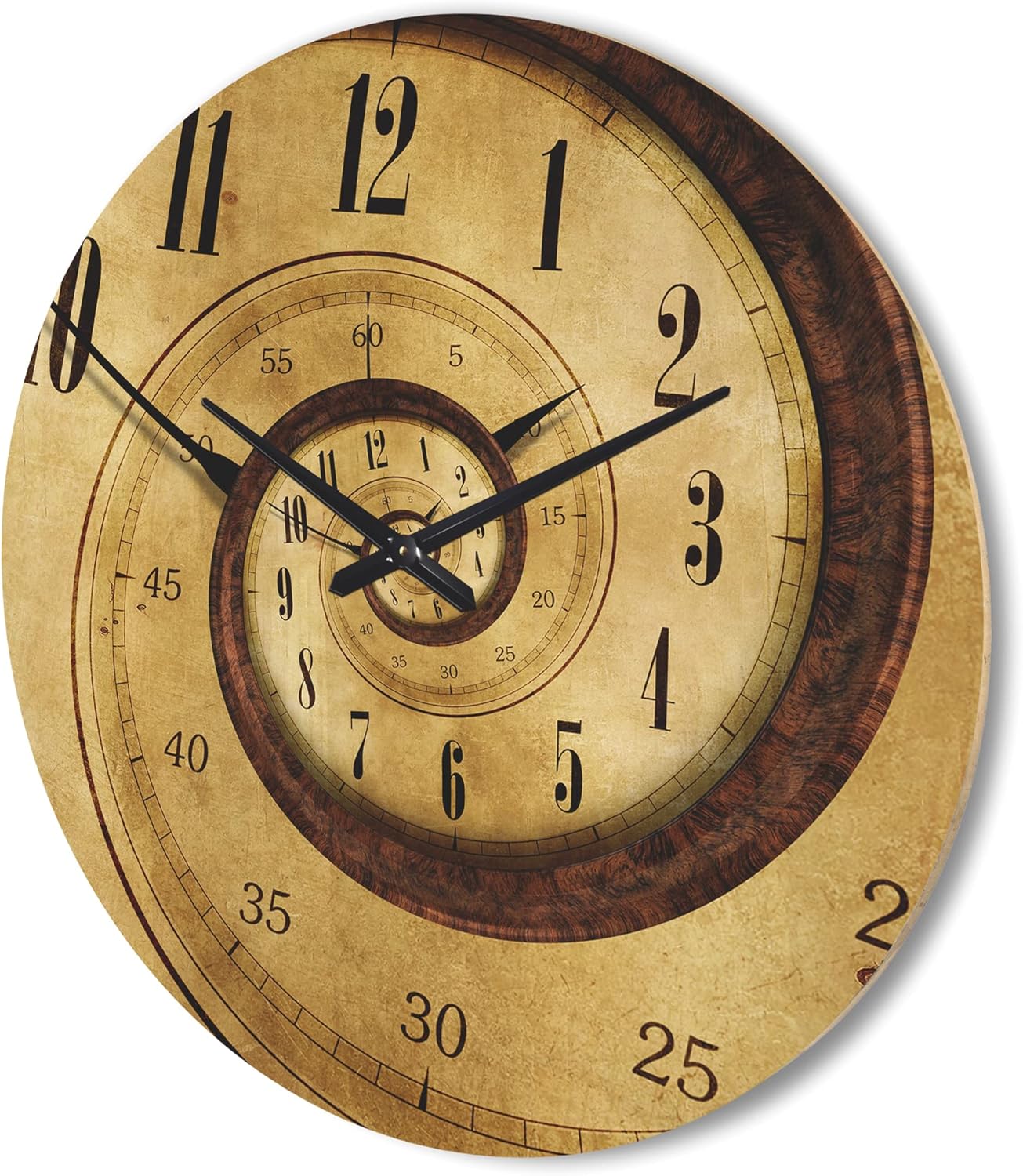 This original Modern round wood wall clock fits in both in rustic decors as well as contemporary spaces. The woodgrain detailing surfaces slightly through the colors of the design, adding to authentic wood character of your artwork wood clock. The Traditional Time Spiral fine art is directly printed on the wood using superior quality 6 Color UV ink, providing an impressive and unique design for your office or home in modern as well as traditional interiors. The natural grain varieties of each panel of wood creates a truly original round wall clock making it the focal point of every room. Features - Style: Modern & Contemporary Type: Wood Wall Art, Fine Art, Wood Fine Art, Print on Plaque - Using the highest quality ink which will not fade over time. - Arrives ready to hang on the wall with hanging kit included - Material: Made with 100% natural pine wood. - Number of Pieces: 1 - Size: Medium, Large, Small - Color: Beige - Country of Origin: Canada - "AA" battery included with your order. - Easy to hang. See Options drop down for available sizes.