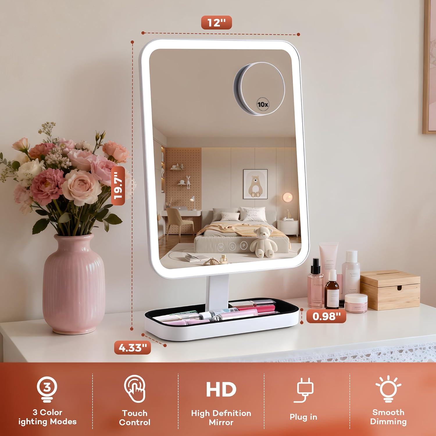 | Additional Features | 3Color Changing, Light Adjustable, Type-C, 10X magnifying mirror, Storage style Hollywood mirror |
