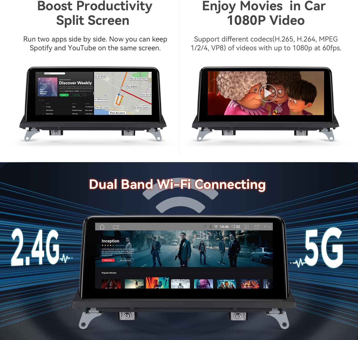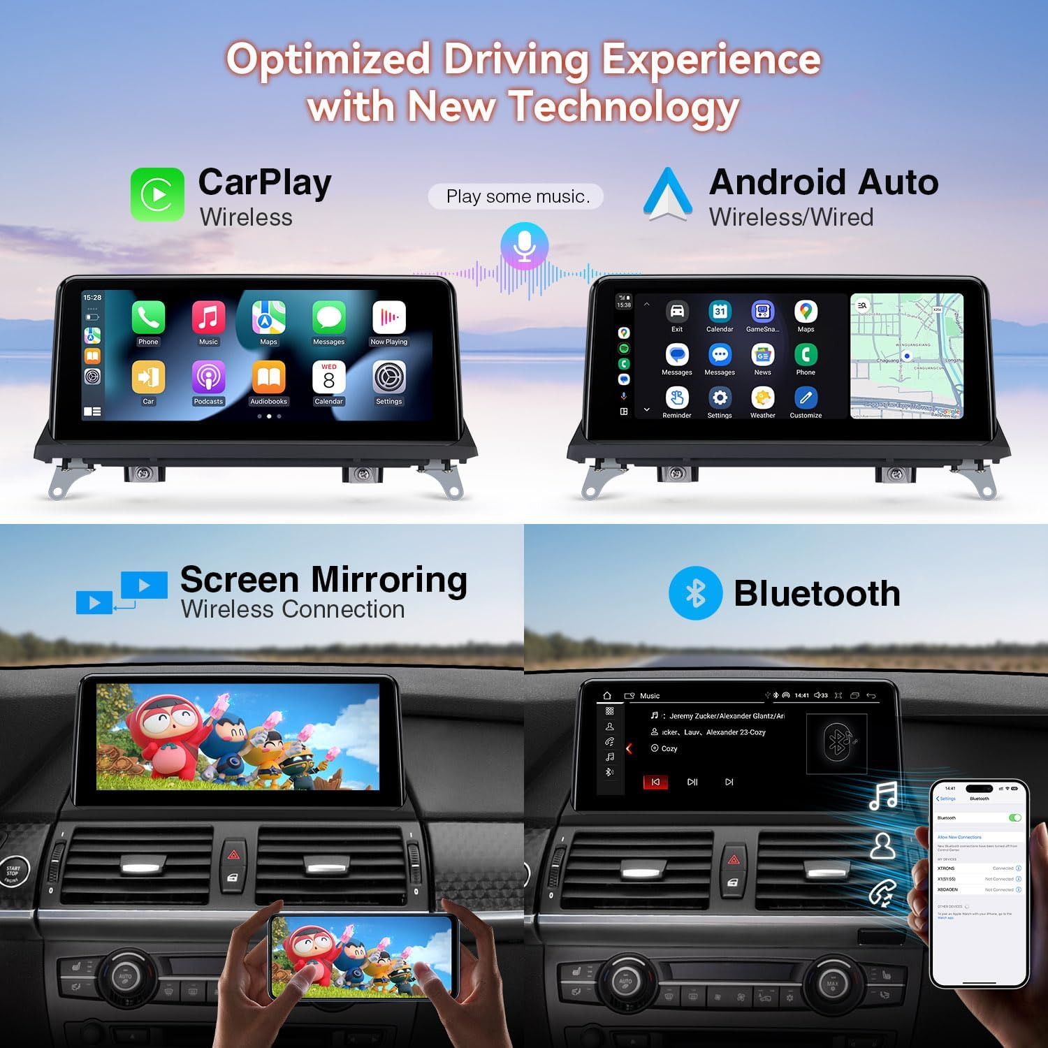 Applicable Models & Years For BMW X5 E70 (2007-2010) with CIC System For BMW X6 E71 (2007-2010) with CIC SystemFeatures: ※ IPS Panel, 178°Viewing Angle Enjoy viewing on a big screen stereo without eye fatigue or discomfort from any angle. ※ Dual Wi-Fi Band Connecting Support both 2.4GHz and 5GHz Wi-Fi networking, with the higher frequency 5GHz being able to move more data around faster. ※ Built-in Wireless CarAutoPlay / Wired Android Auto It compatible with iPhone 5 and newer models with iOs 8 and above, Android phones with Android 4.3 and above. ※ Split-Screen Mode Go ahead listening music in Spotify while navigating, or making phone call with your browser open. ※ GPS Navigation Supports Google Maps, Sygic, Waze and any other navigation software that is compatible with Android OS. ※ Bluetooth 5.0 Connect your smartphone via Bluetooth to use hadsfree calls, number dialing, contact searching, audio streaming safely. Optional Accessories: Need TPMS Function? Please search ASIN: B07WQFKV5G Need Front / Reversing Camera? Please search ASIN: B07HMLYLJJ / B00GY3BVT6 Need External DVR? Please search ASIN: B07MBYCG4C Accessories: 1 × ISO Wiring Harness 1 × USB Cable 1 × GPS Antenna 1 × Tweezers 1 x Mini Speaker 1 × Installation Instructions 1 × User Manual 1 × 4G Antenna(Doesn't support 4G function in the US)